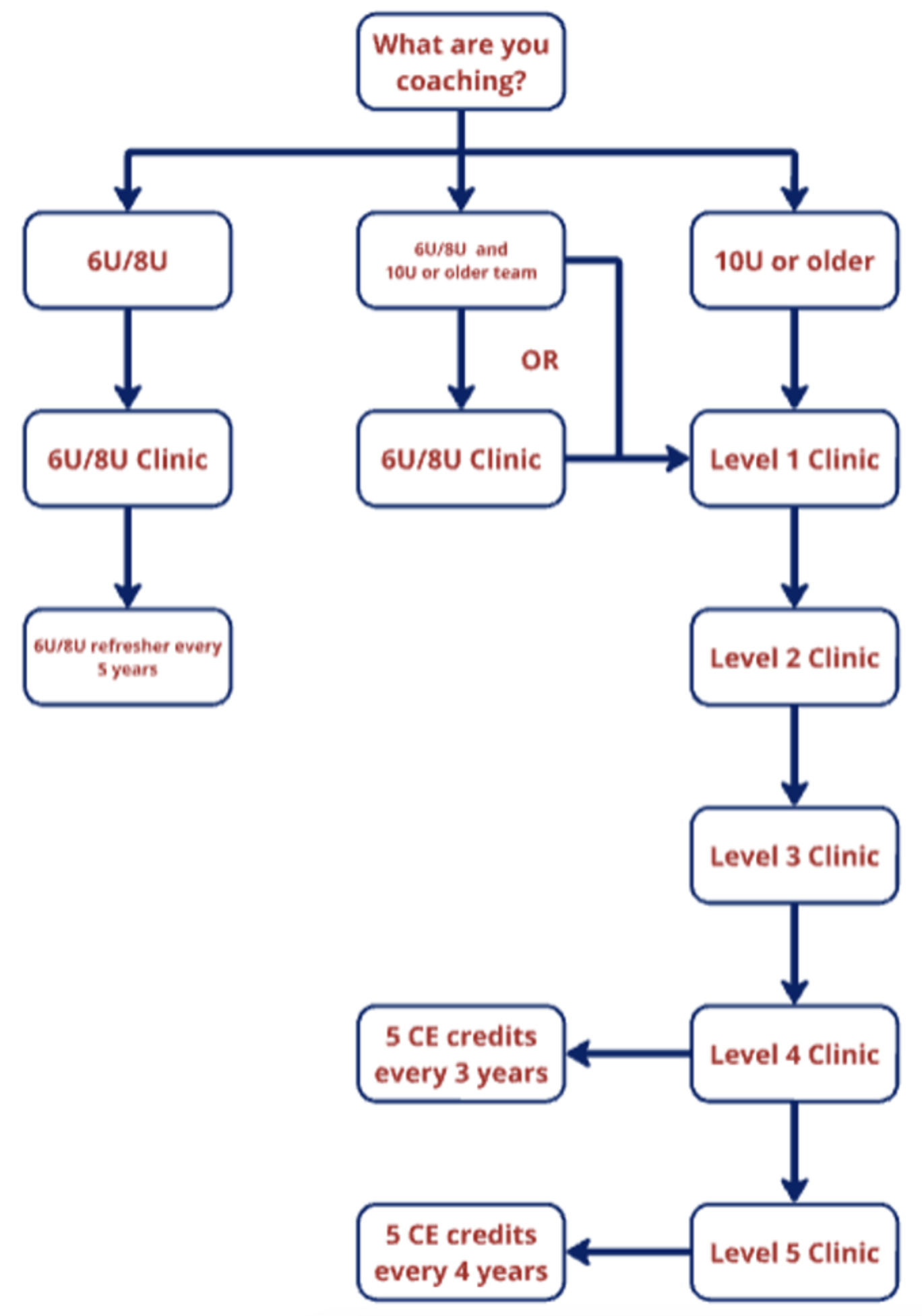 "All coaches must enter USA Hockey's Coaching Education Program at the 6U/8U clinic if coaching Learn To Skate, Learn To Play, and/or 6U/8U classifications or a Level 1 clinic if they are coaching 10U classification and above."