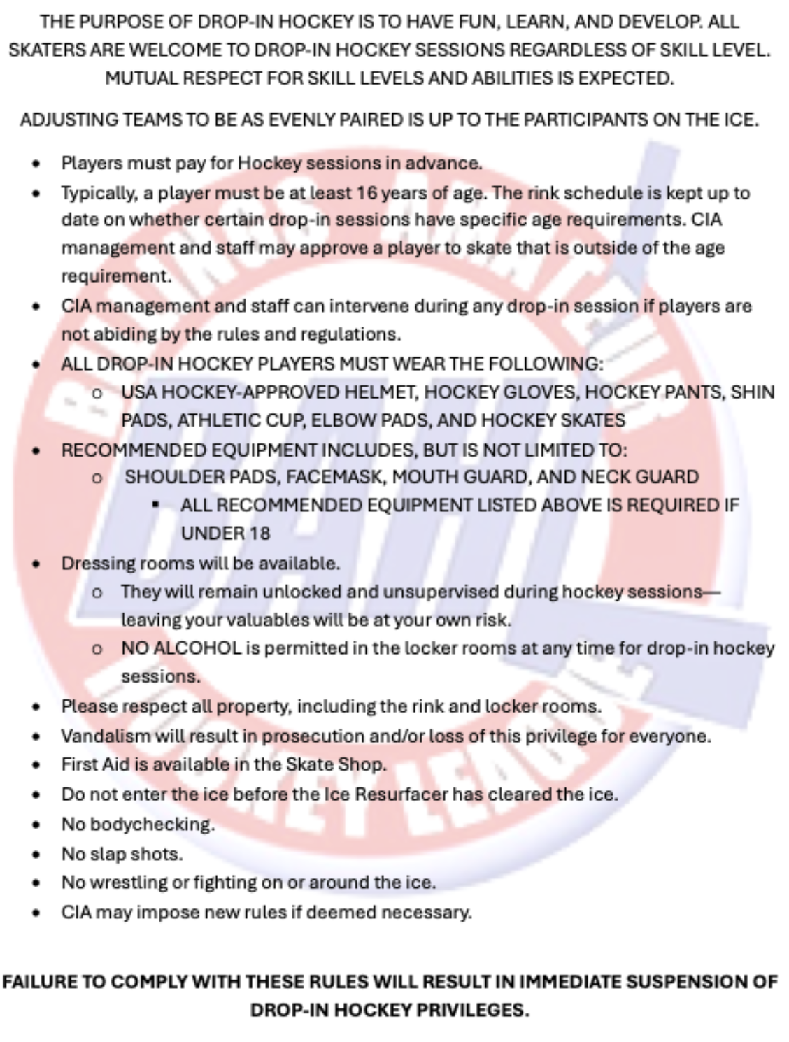 The schedule for drop-in hockey and stick-n-pucks may vary.
